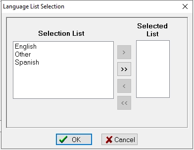 Select the code in the selection and click the right arrow to moved them to the Selected List until all required Languages have been selected. Click OK to continue. Use the double arrows to move all codes to or from the selected list and the left arrow to remove them from the list.