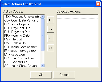On the left column is a list of all the action items currently defined on your system. The right column will be blank until you select one or more action item types and move them over. To select an action item from the column on the left, use your mouse to click on the action code, then click on right arrow. The action will be moved to the column on the right. You can continue selecting actions individually or you can hold down the Ctrl key while clicking on actions to be selected. All the action item types you select will remain highlighted. Click on double right arrow to move all the selected actions to the right hand column. If you make a mistake, you can select the action from the right column and click on the left arrow. The action item will move back to the original column. To move all the action items from one column to the other you can click on double left arrow.