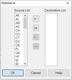 Select the code in the selection and click the right arrow to moved them to the Selected List until all required State codes have been selected. Click OK to continue. Use the double arrows to move all codes to or from the selected list and the left arrow to remove them from the list.