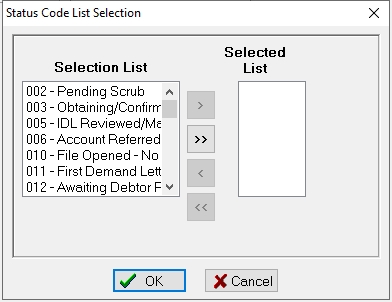 Select the code in the selection and click the right arrow to moved them to the Selected List until all required status codes have been selected. Click OK to continue. Use the double arrows to move all codes to or from the selected list and the left arrow to remove them from the list.
