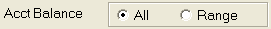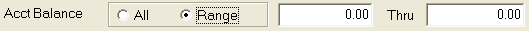 If Range is selected, two balance fields will be displayed on the screen. Enter the beginning of the balance range in the first field. Enter the end of the balance range in the second field. I.E. 5000.00 thru 20.00