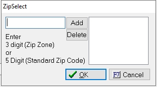 Enter the Zip Code or Zip Zone and click the Add button to add to the list. Highlight the zip or zip zone in the list and click delete to remove it from the selected list.