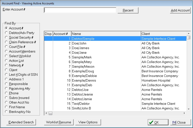 up the Find Debtor Screen.