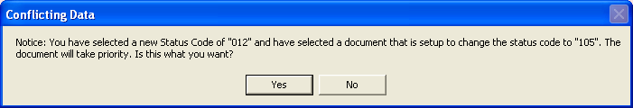 If the document you have selected is set to change the status code on the account and you have also elected to change the status in the 'New Status' field, CollectMax will inform you by way of a message box that the status change of the document will take priority.