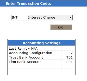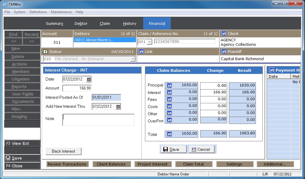 Interest may be charged to claims both manually and automatically. Manual interest may be entered anytime using this transaction. When you enter the transaction, the interest date will be brought forward to the transaction date and interest charges will be calculated to the transaction date.