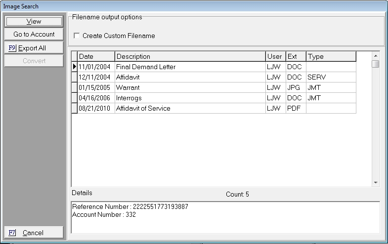 The Image Search Feature exports images to a selected directory location on your network. Each image creates a file in that directory. The files will be named with the Document Management ID which is a combination of the account number and the imaged date and time. The Custom File Naming feature allows you to give your images a naming convention for the exported files.