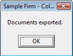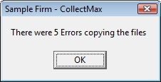 Click the button to exit the message. The export process will create a error log file named ImageExportErrors.txt in the Client location of CollectMax. This is typically c:\program files\js technologies\cmwin. The error log will list the documents that were not exported and a brief description of why they could not be exported.