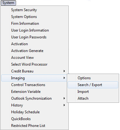 From the Menu Bar of CollectMax, click the System, Imaging and Search.