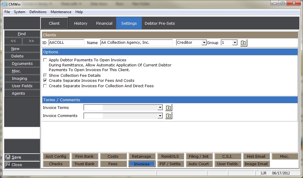 CollectMax allows users per client account to customize invoices and apply debtor payment monies to pay open (past-due) invoices.