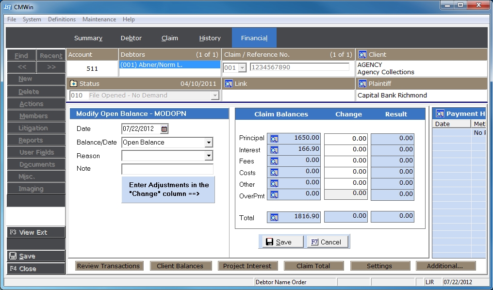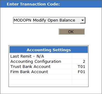 This transaction allows you to modify the Open Balance or Date on an account. This MODOPN can only be used if no other financial transactions have been posted on the claim.