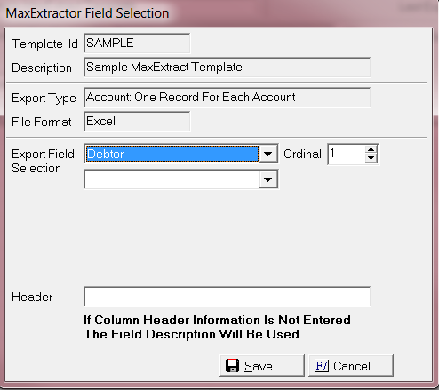 If you select the Export Field Selection for "Debtor". The following options are available: