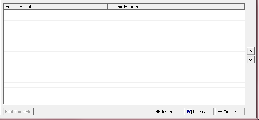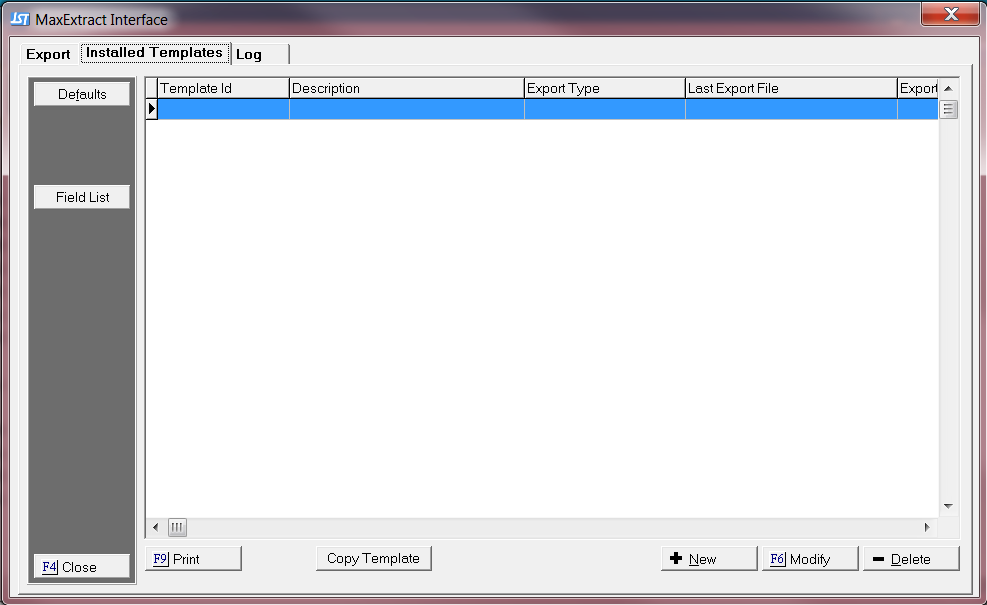 On this screen a list of the current templates will be displayed. From this screen, a user can set the defaults, add a new template, modify and existing template, copy a template, delete an existing template or print a list of available fields.