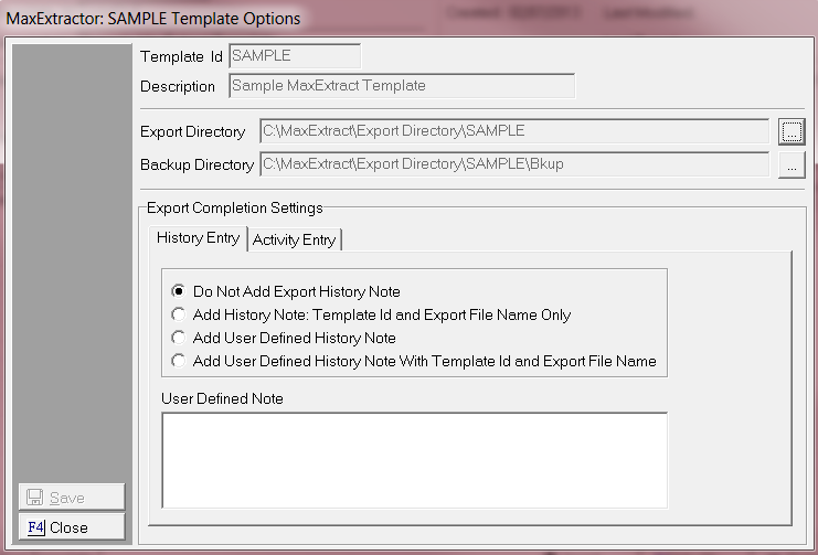 - Add User Defined History Note with Template ID and Export File Name: This allows you to select a custom history note that will add to each account after export and it will include a Template ID and Export File Name.