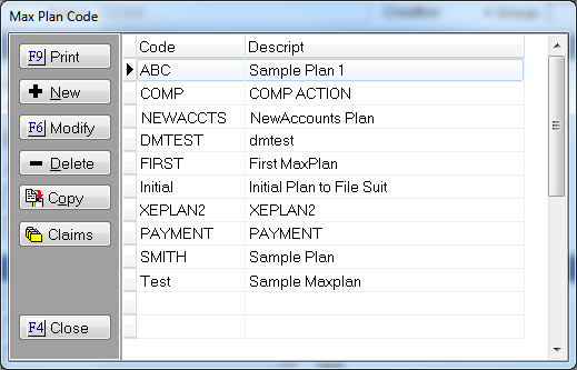 Here you can print the list of existing MaxPlans, create a new plan, and copy, modify or delete an existing plan. The Claims button will display a list of claims that are currently on the highlighted plan which can be exported as well.
