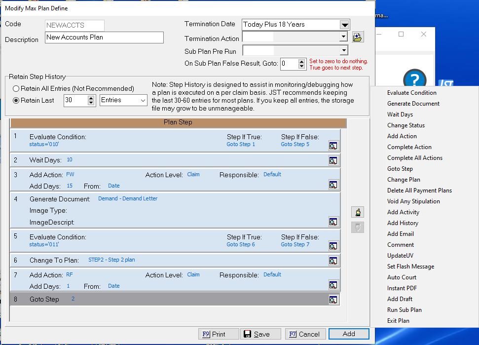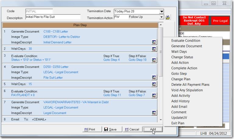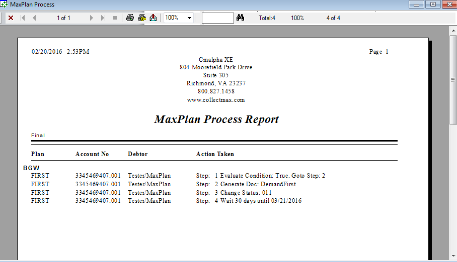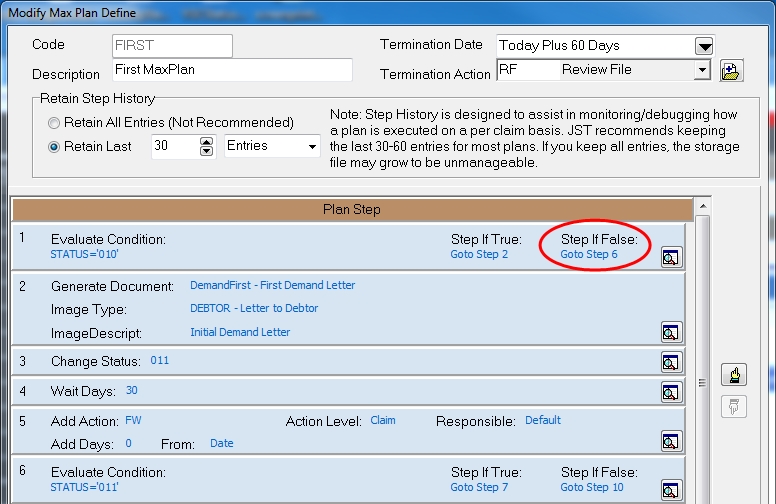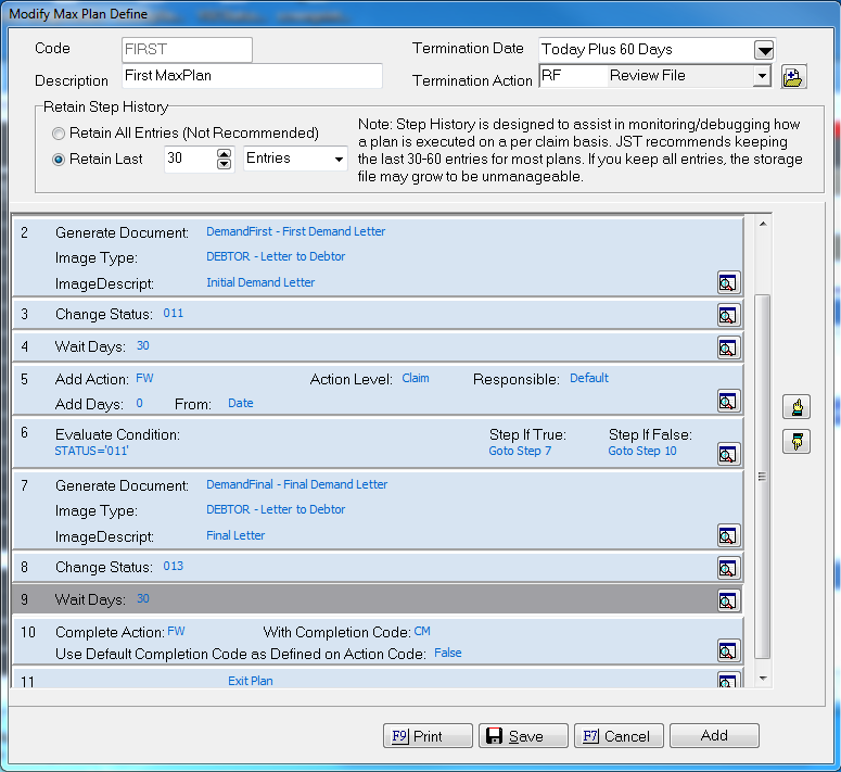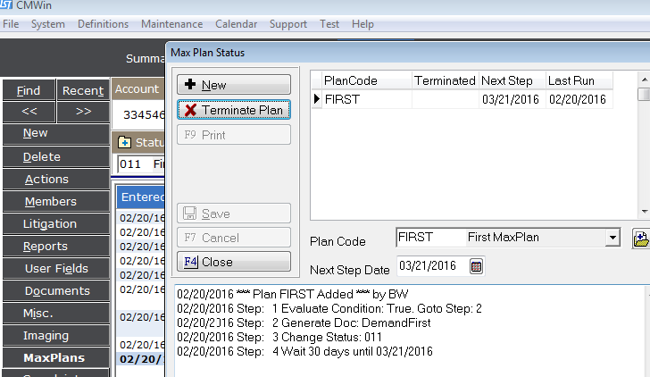 MaxPlans is an extremely powerful tool that allows CollectMax users to automatically manage workflows via user defined steps. With Maxplans, events such as evaluating a condition, generating a document, adding an action item, sending an email, changing a status, or a delay in activity can be performed without the need for someone to review each file in order to move the account through the workflow process.