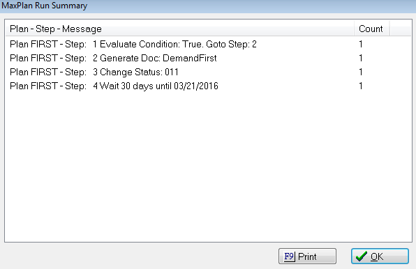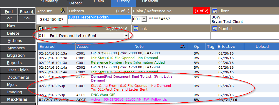 As seen below in History, the MaxPlan generated the Demand Letter, changed the status, and added the FW action code.