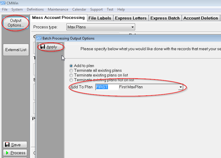 The next method of adding claims to MaxPlans is through Batch Processes. This method is beneficial if you have recently added a MaxPlan template and want to attach it to existing claims. To do this, choose MaxPlans from the Process Type drop-down menu. Select your criteria, and click the Output Options button on the left. From the Add to Plan drop-down menu, select your plan and click Apply.