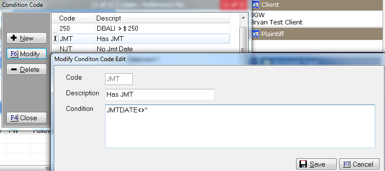 The Condition Codes allows you to save your more frequently used conditions into their very own code. Here is an example of a condition used to identify a judgment.