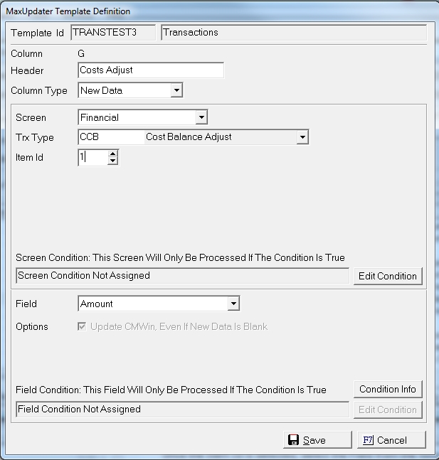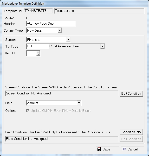 In the MaxUpdaterPlus template creator, select the Financial screen and FEE to translate the data in the column to a FEE transaction. Users may have as many columns of FEE transactions as needed. However in doing so, they must associate all the fields for each action using the Item ID.