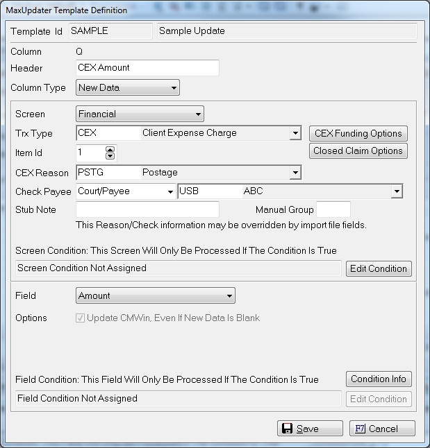 In the MaxUpdaterPlus template creator, select the Financial screen and CEX to translate the data in the column to a CEX transaction. Users may have as many columns of CEX transactions as needed. However in doing so, they must associate all the fields for each action using the Item ID.