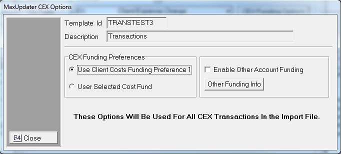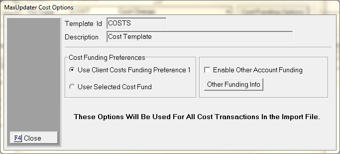 Choose between the following two funding options: Use Client Costs Funding Preferences 1 or User Selected Cost Fund. If there are not enough funds in the funding source/sources, MaxUpdaterPlus will not post the COST and will create an exception on the import report.