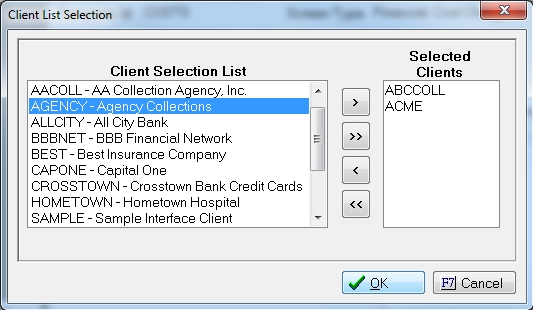 To select the client, click on the client in the Client Selection List and click the button to move it to the Selected Clients List. Continue until all clients have been selected. To Remove a Client ID from the selected list, click the