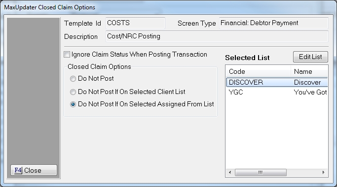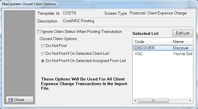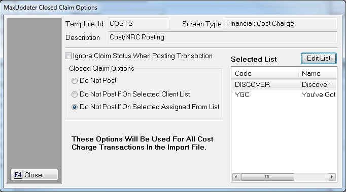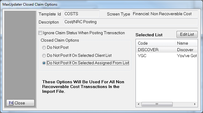 Select the button next to Do Not Post If On Selected Assigned From List if you want Costs to post regardless of Claim Status on all accounts except the ones with the selected Assigned Froms. Any Account attached to the selected Assigned From/Interfaces will not post a cost transaction if the Claim is Closed but will post costs on closed account for other Assigned Froms/Interfaces.