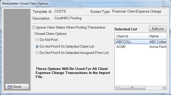 Select the button next to Do Not Post If On Selected Client, if you would like the Costs to post regardless of Claim Status on all accounts except the ones with the selected clients. Any Account attached to the selected client(s) will not post a cost transaction if the Claim is Closed but will post costs on closed account for other Clients.