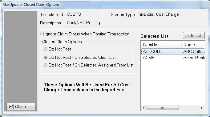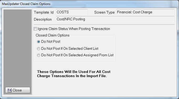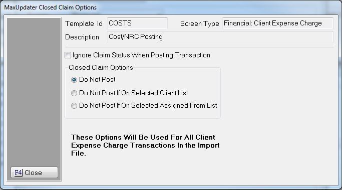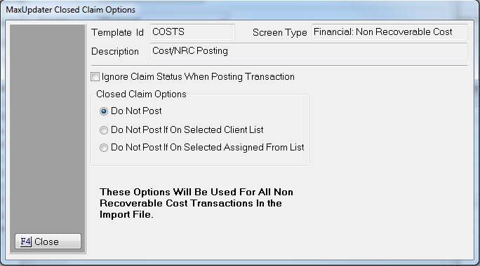 Select the button next to Do Not Post, if you would like to keep the MaxUpdaterPlus from posting a Cost on a Closed Claim. A exception will be listed on the accounts that were not posted because of a Closed Claim Status.