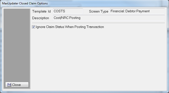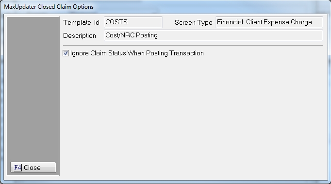 The Closed Claim options will allow you to determine if you want to post costs to closed claims. Click the to set the posting options.