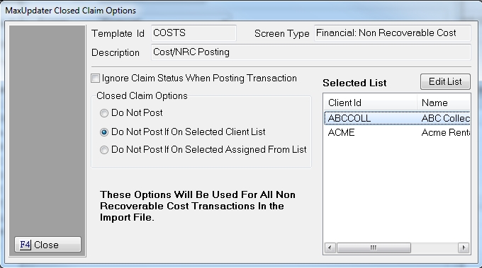 Select the button next to Do Not Post, if you would like to keep the MaxUpdaterPlus from posting a NRC on a Closed Claim. A exception will be listed on the accounts that were not posted because of a Closed Claim Status.