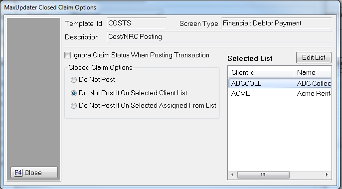 By Default the option will be set to post Payments no matter the Claim Status. To override this setting and stop PMT transactions from posting for closed claims, or by Client ID or Assigned From, uncheck the box next to the Ignore Claim Status When Posting Transaction Selection. To display the Closed Claim Override Settings.