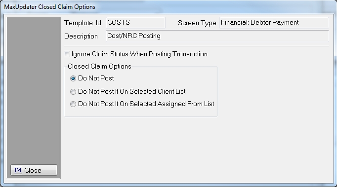 Select the button next to Do Not Post, if you would like to keep the MaxUpdaterPlus from posting a PMT on a Closed Claim. A exception will be listed on the accounts that were not posted because of a Closed Claim Status.