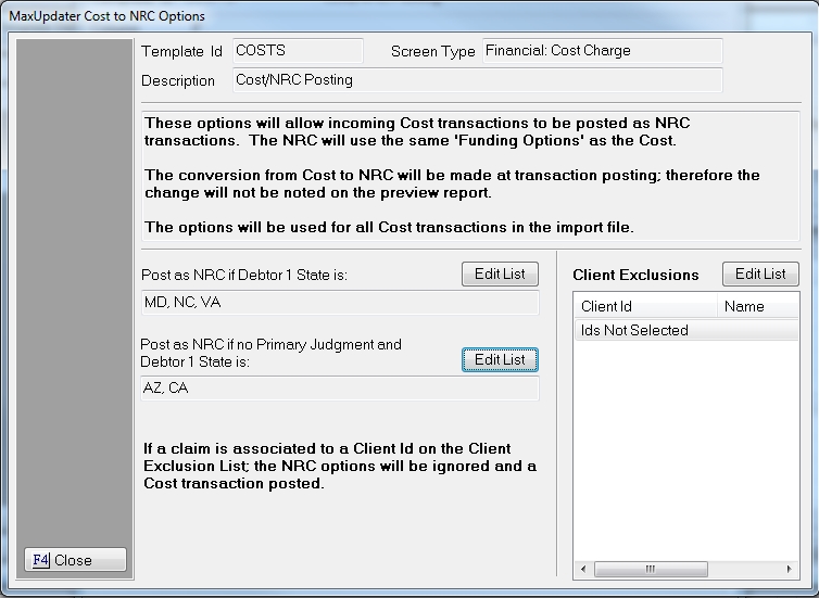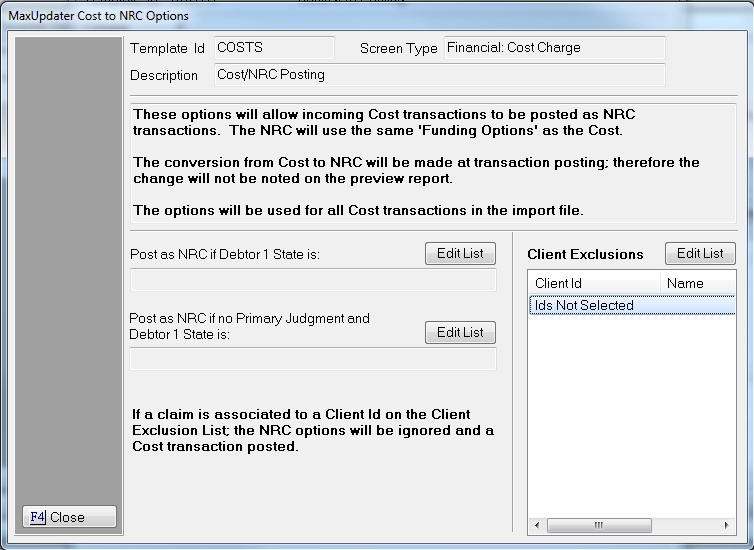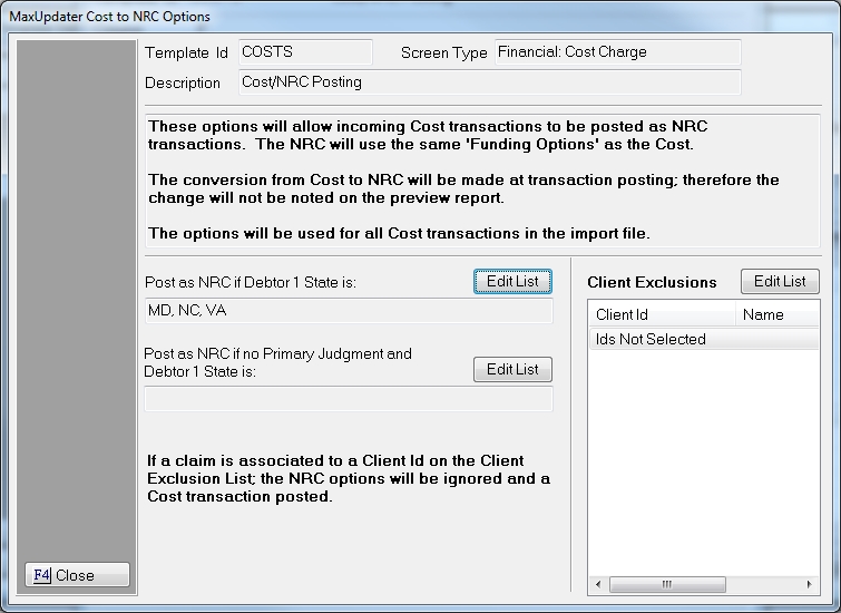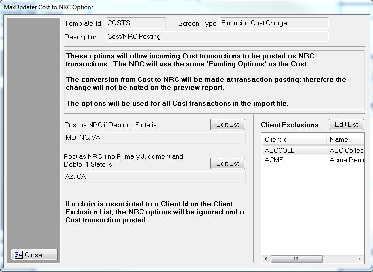 The MaxUpdaterPlus allows you to Post an NRC instead of a COST Charge if the account meets certain set criteria such as State and Legal Stage. Also the module allows you to override the set criteria for selected Client IDs.
