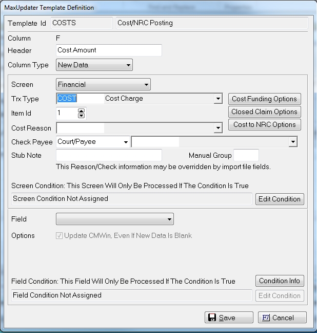 In the MaxUpdaterPlus template creator, select the Financial screen and Cost Charge.