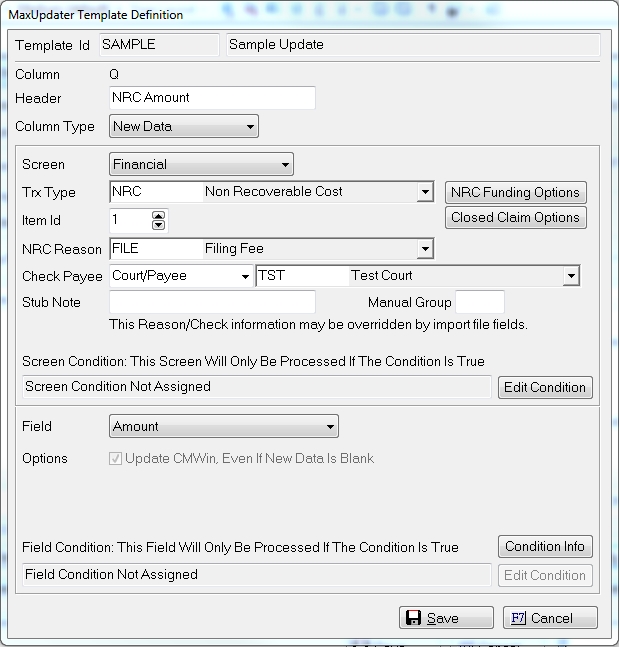 Note: The MaxUpdaterPlus preview import report does not check fund availabilities or proper funding sources because NRC transactions and Client Setting changes can be posted between the preview and final. In the MaxUpdaterPlus template creator, select the Financial screen and