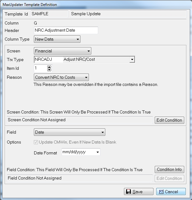 In the MaxUpdaterPlus template creator, select the Financial screen and NRCADJ to translate the data in the columns to a NRCADJ transaction. Users may have as many columns of NRCADJ transactions as needed. However in doing so, they must associate all the fields for each action using the Item ID. Only Adjustment to the NRC Amounts and COST Amounts can be done with this Transaction. If you need to adjust other balance components use an ADJDB Transaction.