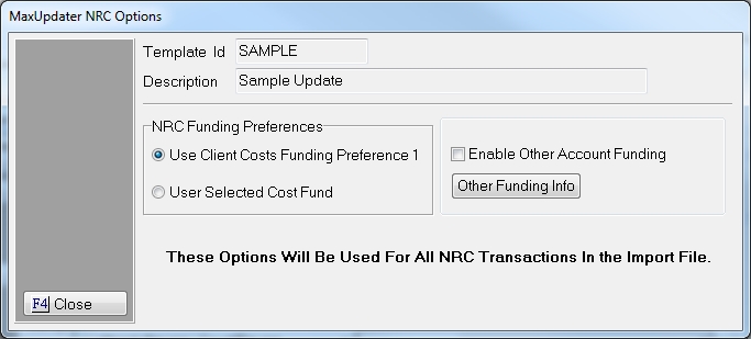 Choose between the following two funding options: Use Client NRC Funding Preferences 1 or User Selected NRC Fund. If there are not enough funds in the funding source/sources, MaxUpdaterPlus will not post the NRC and will create an exception on the import report.