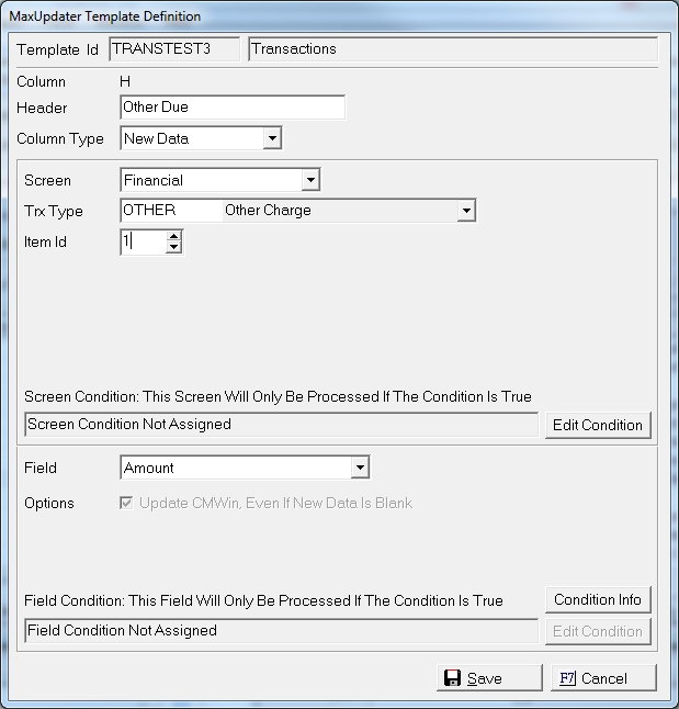 In the MaxUpdaterPlus template creator, select the Financial screen and OTHER to translate the data in the column to a OTHER transaction. Users may have as many columns of OTHER transactions as needed. However in doing so, they must associate all the fields for each action using the Item ID.