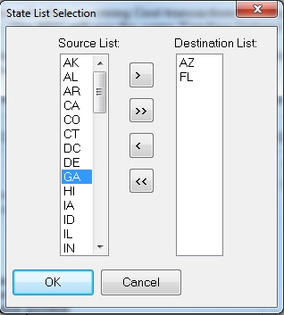 To select the State, click on the State in the Source List and click the button to move it to the Destination List. Continue until all States have been selected. To Remove a State from the Destination list, click the