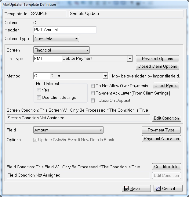 In the MaxUpdaterPlus template creator, select the Financial screen and PMT