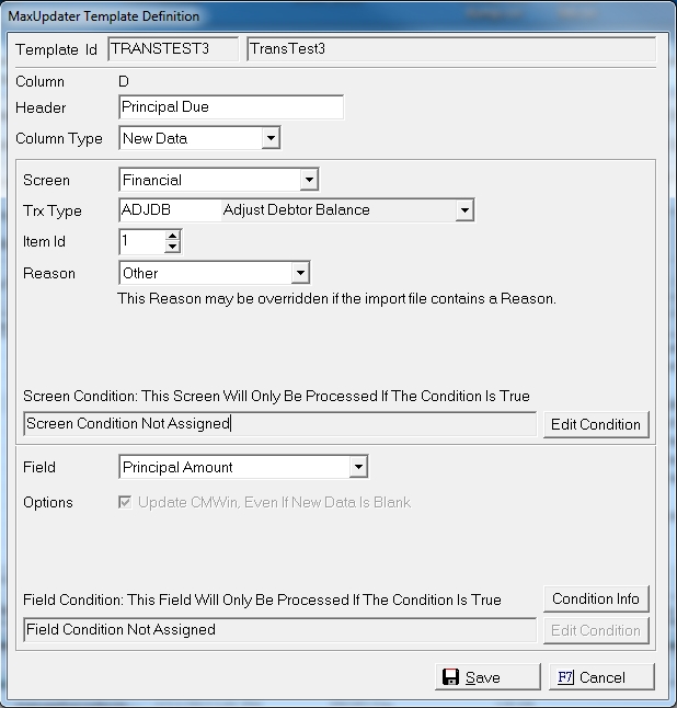In the MaxUpdaterPlus template creator, select the Financial screen and ADJDB to translate the data in the column to a ADJDB transaction. Users may have as many columns of ADJDB transactions as needed. However in doing so, they must associate all the fields for each action using the Item ID.