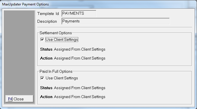 SIF/PIF: The payment process will use the Client Settings options. To override those settings, uncheck the Use Client Settings button and select the new status and/or new action to be added for PIF and/or SIF payments.
