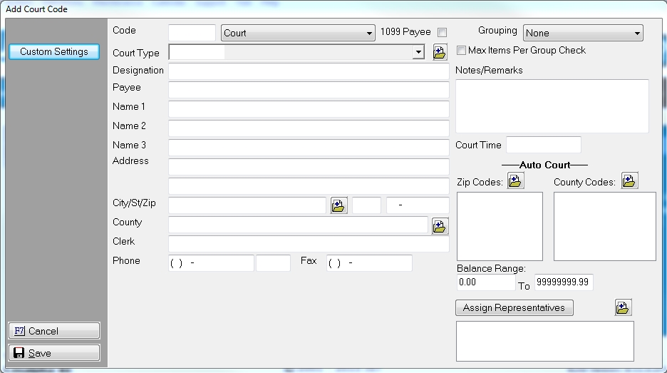 Enter the following to add a new Court and/or Payee to CollectMax: