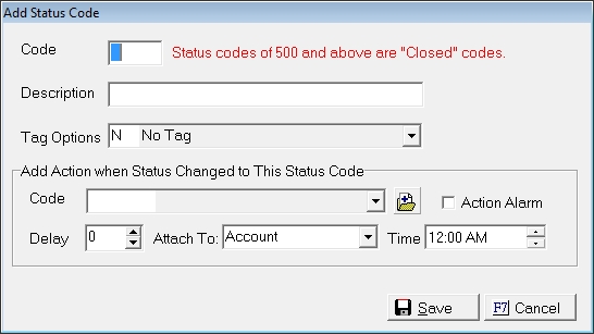 Code: Enter a numerical code for your Status. Remember that CollectMax has a "Closed" account threshold of 500 and above. Therefore if your new status code is for an open status, be sure the numerical code is less than 500. Conversely, if the new status code is to represent a closed account status, be sure to assign a numerical code greater than 500.