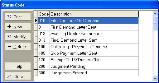 Description: Enter the Description of this Status Code. The status description you enter will appear on the debtor processing screens and optionally will be printed on reports.