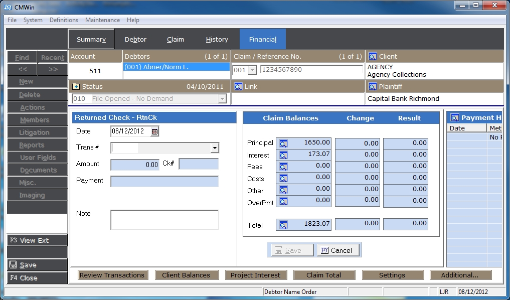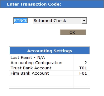 This transaction allows you to record a returned check. By selecting the original payment transaction, the RTNCK will reverse the original application of the payment. See How to Handle Returned Checks