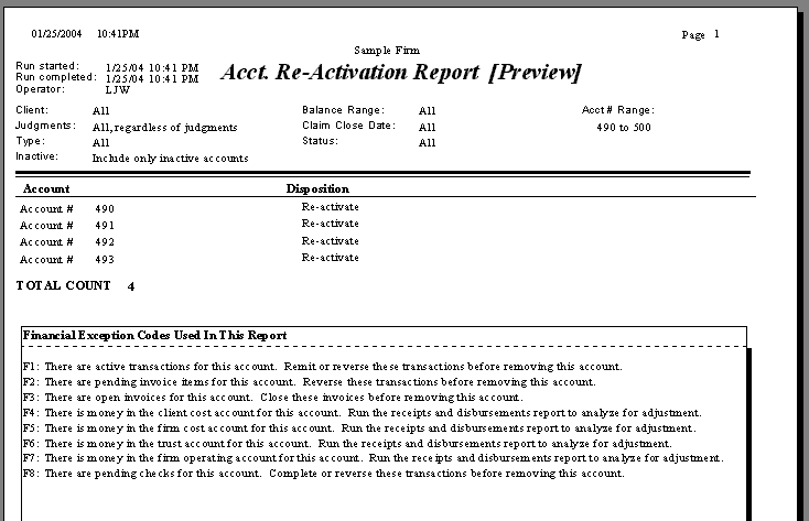 A preview report will print listing the accounts that have been selected for the batch and the action to be taken on these accounts.