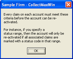 The batch account re-activation allows you to move a group of inactive accounts to the active account list. Use the selection criteria to narrow the group of debtors to be re-activated.