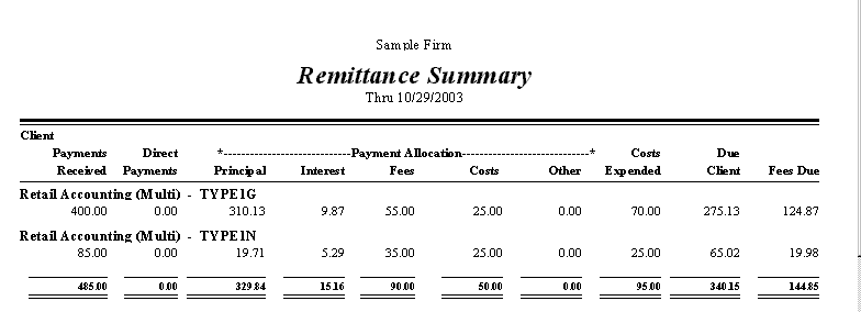 The Remittance Summary Report is a summary of the total payments received per client, the total allocations for these payments, cost expended and amounts due the client and the firm.